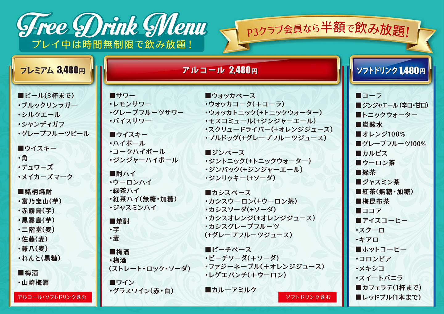 P3クラブ会員なら、飲み放題がいつでも全て半額に!