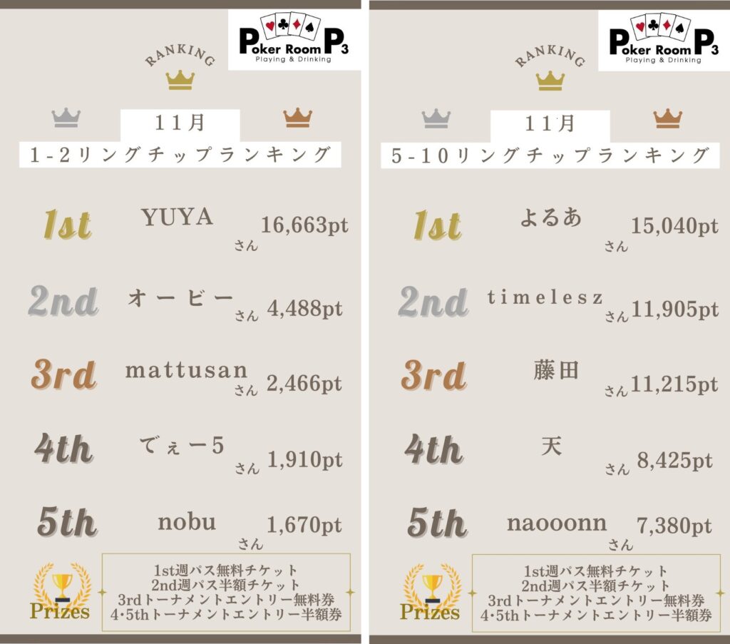 2025年12月1日 / 最終更新日時 : 2026年1月1日 msadmin お知らせ P3リングランキング【11月】結果発表! 11月のリングチップランキング結果です!✨ 入賞された皆さんおめでとうございます!!🎊