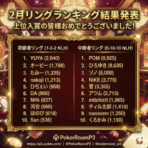 2026年2月27日 / 最終更新日時 : 2026年3月1日 msadmin お知らせ ✨2月 P3感謝祭✨ 優勝者は.…‼️ オービーさんです! 優勝おめでとうございます㊗️🎉 2位🥈Ave.さん🥈 3位🥉KOUCHAさん🥉 4位🌟マリオさん🌟 5位💣ERINAさん💣 6位🐴菅さん🐴 皆さん入賞おめでとうございます👏